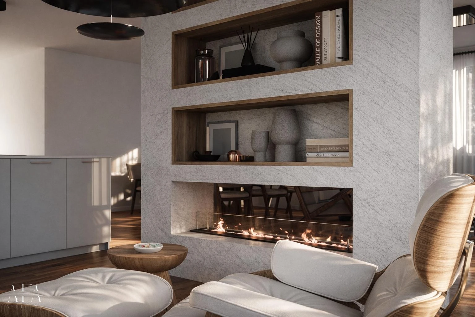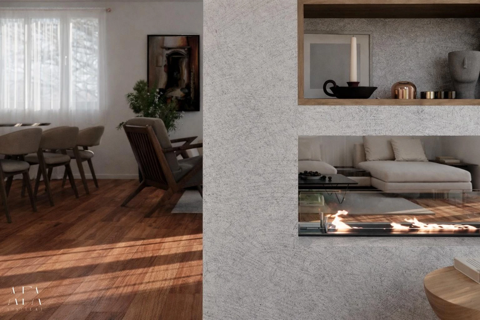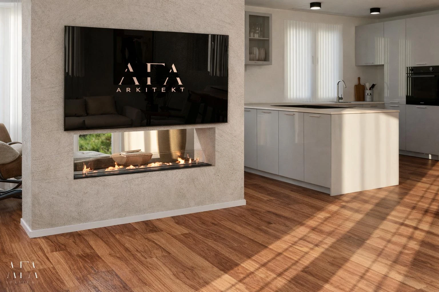This project is designed as an open-plan living space where the kitchen, dining area, and lounge connect seamlessly. A double-sided fireplace acts as the central feature, organizing the space without closing it off, while adding warmth and atmosphere to both sides.
