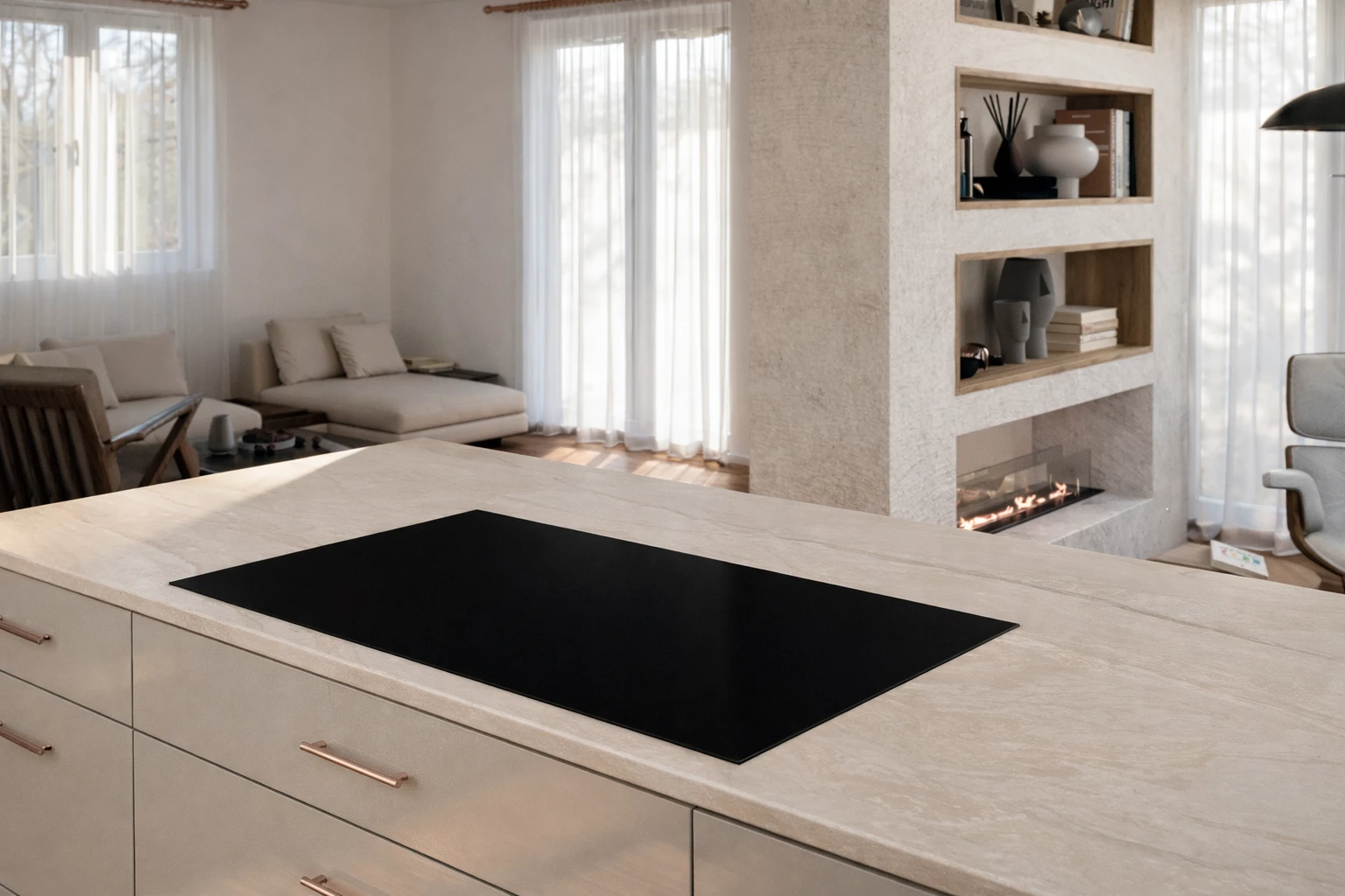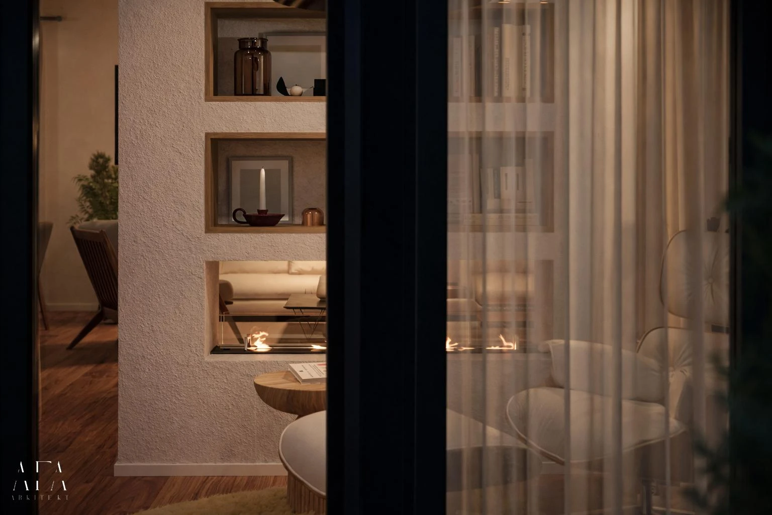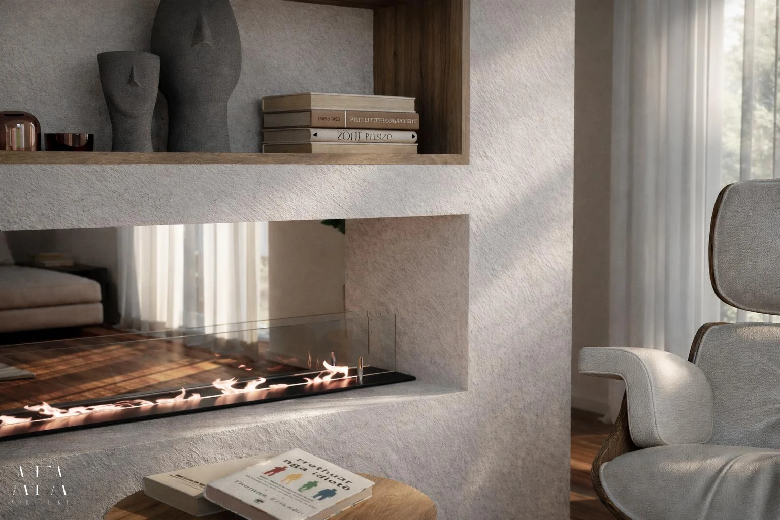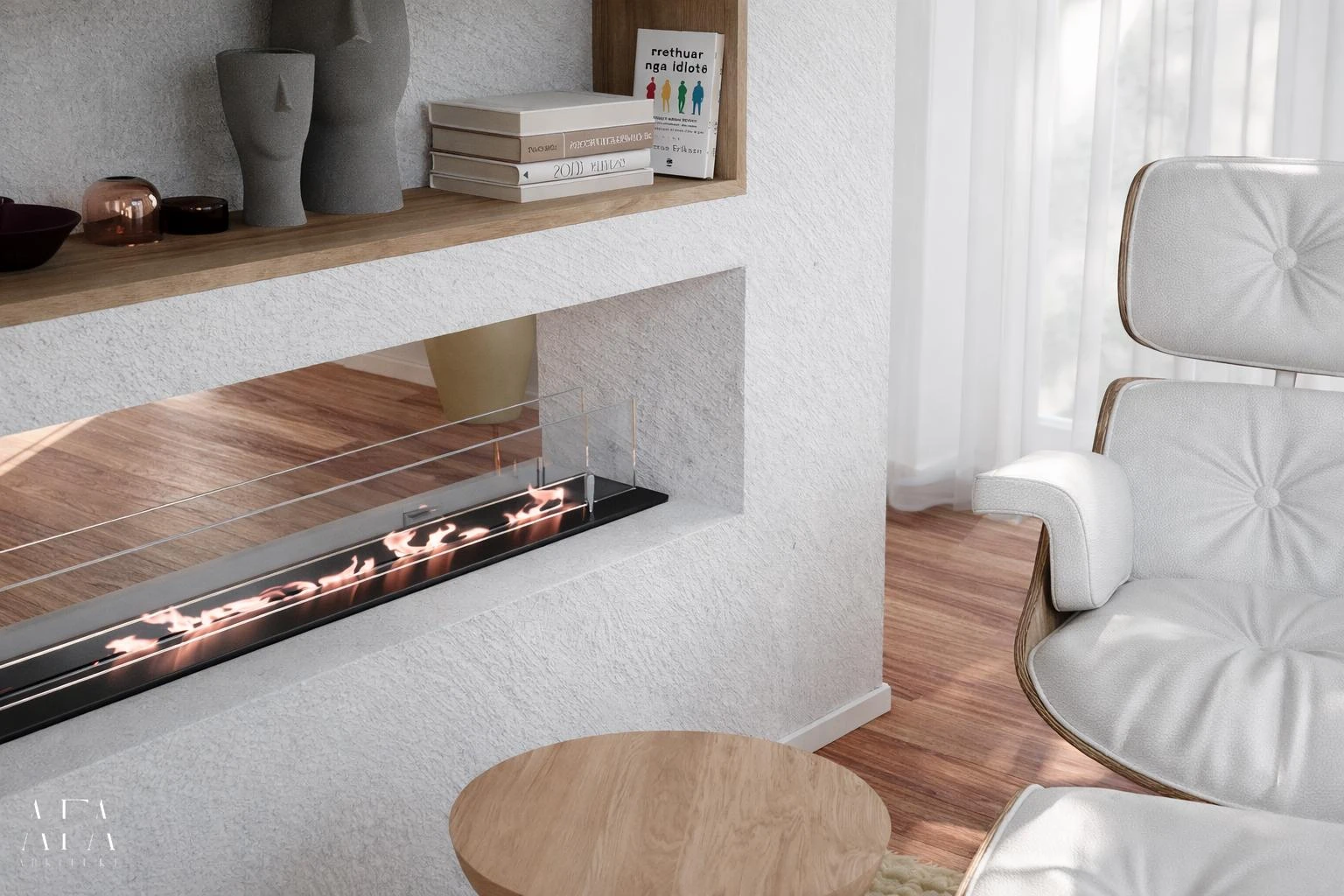 This project is designed as an open-plan living space where the kitchen, dining area, and lounge connect seamlessly. A double-sided fireplace acts as the central feature, organizing the space without closing it off, while adding warmth and atmosphere to both sides.