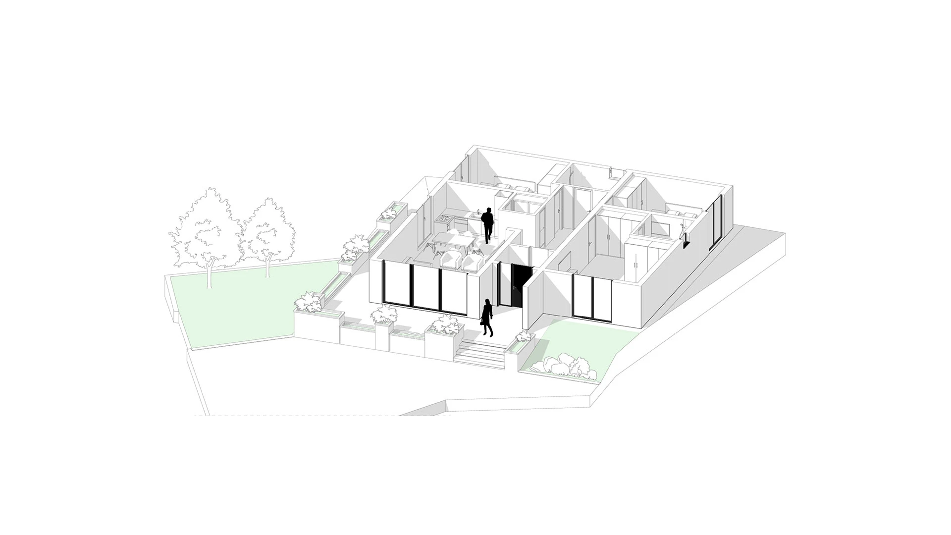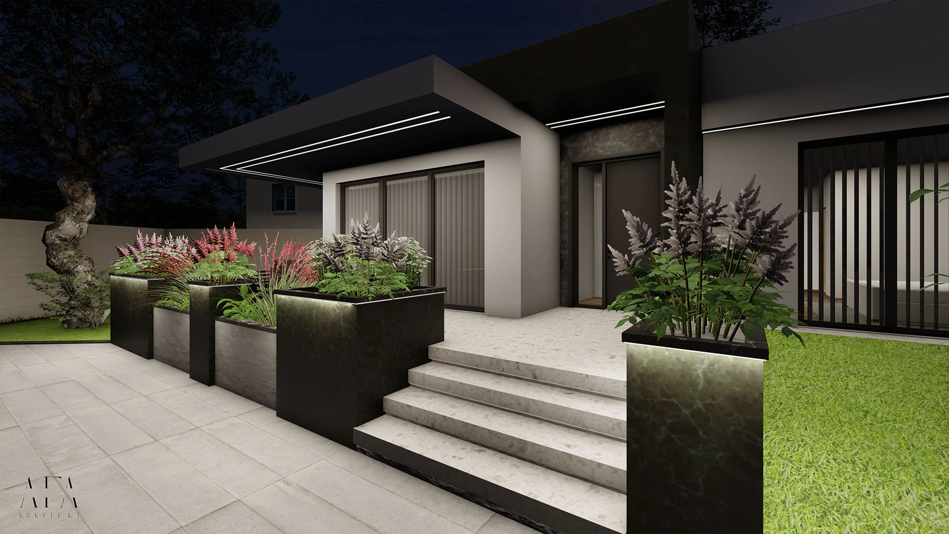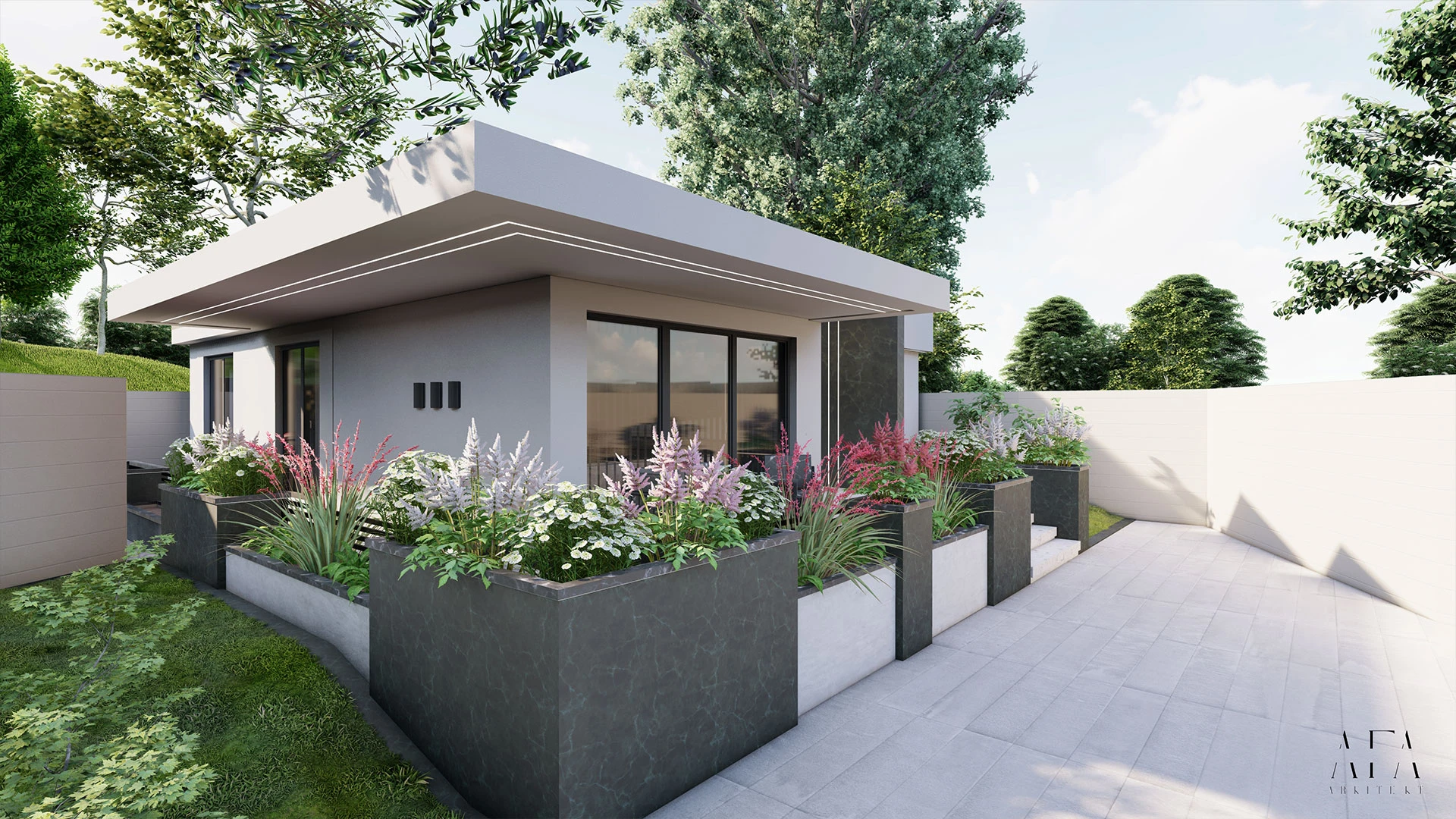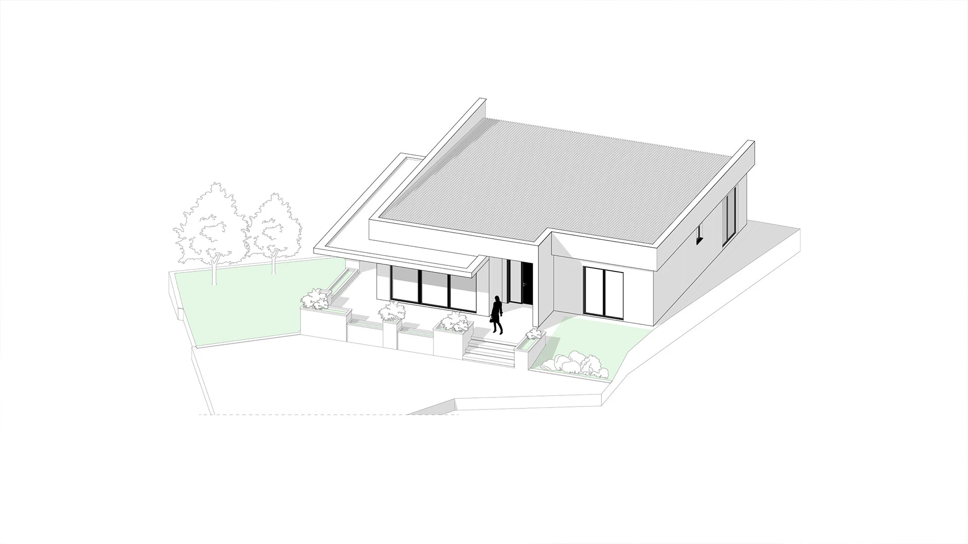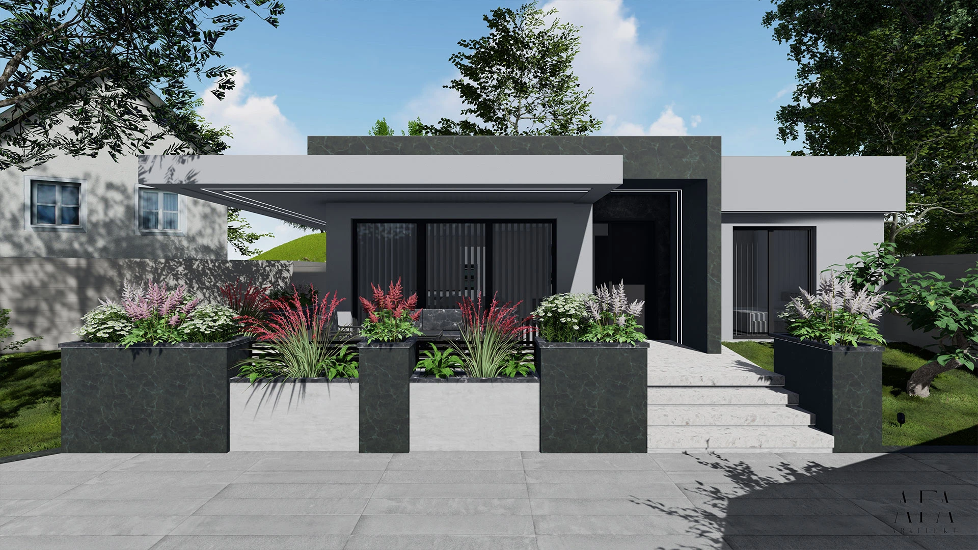 Large window sections allow generous natural light and establish a strong connection to the surrounding garden. The entrance area is emphasized with wide steps and integrated planters, adding character and architectural presence.